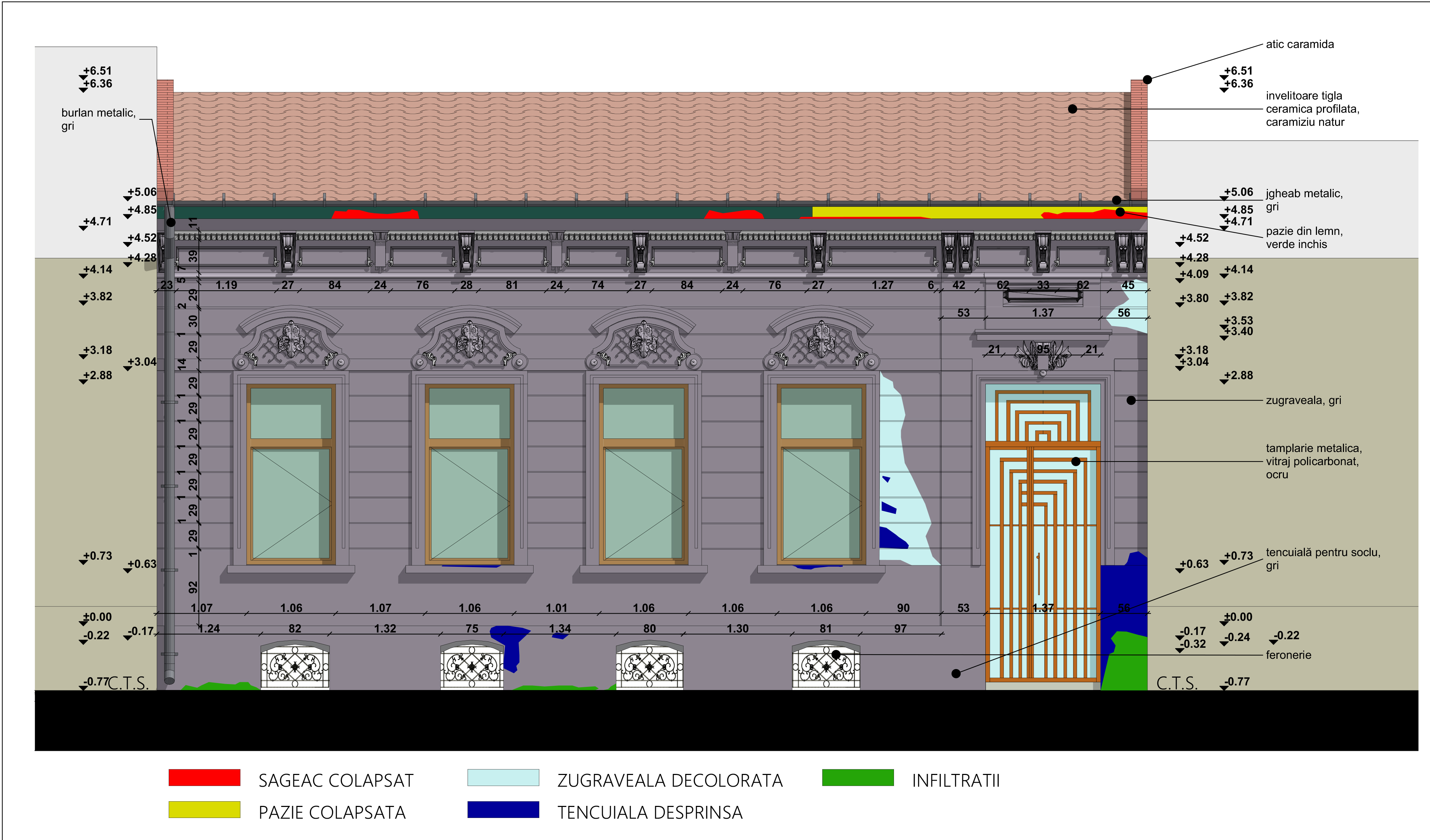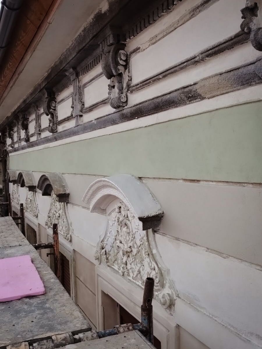 Un element important al restaurării a fost studiul detaliat al straturilor cromatice ale fațadei, realizat prin probe aplicate pe o travee a clădirii. Aceste analize au permis identificarea și conservarea substanței originare, ceea ce a condus la selecția unor coduri de culori din paletarul furnizorului Baumit, un detaliu esențial în restaurările de patrimoniu, unde autenticitatea cromatică joacă un rol decisiv. În acest context, materialele furnizate de Baumit au fost esențiale, datorită caracteristicilor lor superioare, în special în ceea ce privește permeabilitatea la vapori. Pentru clădirile cu valoare istorică, este crucial ca materialele utilizate să permită pereților să „respire”, prevenind acumularea umezelii și deteriorarea structurii interne. Tencuielile pe bază de var hidraulic, folosite în acest proiect, sunt ideale pentru astfel de clădiri, datorită capacității lor de a permite circulația aerului prin pereți. Vopselurile Baumit sunt cunoscute pentru capacitatea lor de a permite peretelui să respire, oferind în același timp o protecție durabilă împotriva factorilor de mediu, cum ar fi ploaia și radiațiile UV. Codurile de culori folosite pentru fațadă includ 0937 pentru suprafețele principale, alb 0018 pentru ancadramente și 1026 pentru alte detalii arhitecturale.